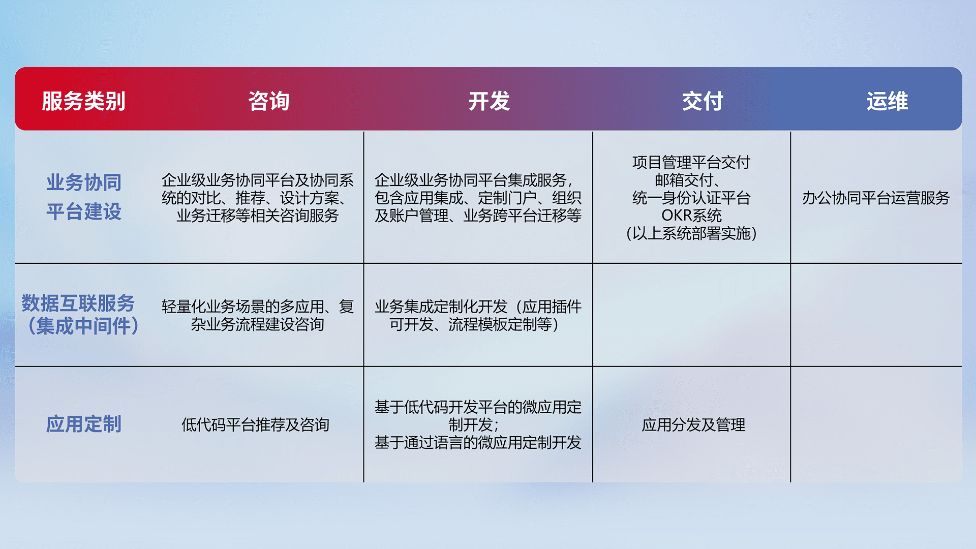 针对钉钉、、、、企微、、、、IDaas等平台级产品提供产品的规划、、、、方案、、、交付、、定制化开发等服务,,实现如统一协同办公、、、智能客户服务、、混合会议管理、、、智能数据查询、、、等业务场景,,实现数字化转型。。。